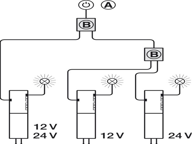 Gjithashtu, mund të lidhni 3 sisteme me tension të njëjtë nëse, për shembull, kërkohet më shumë fuqi në një sistem 12 V.