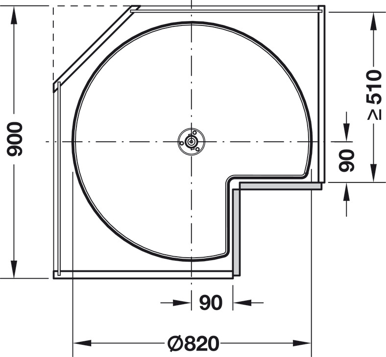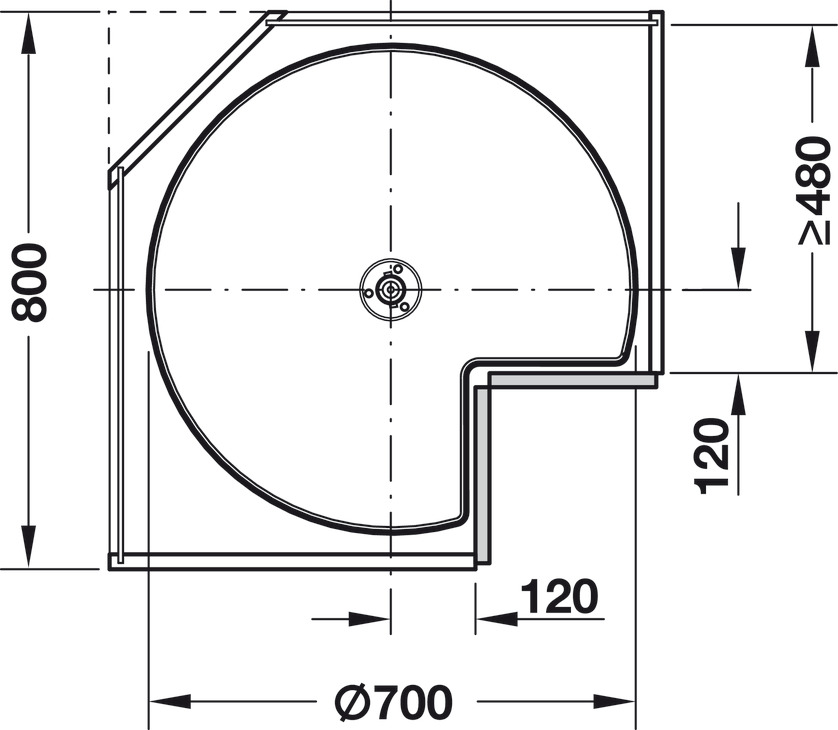 - Mekanizëm rrotullues për kënd të verbër, diametër 700 mm, i përshtatshëm për njësinë e dollapit 800 x 800 mm